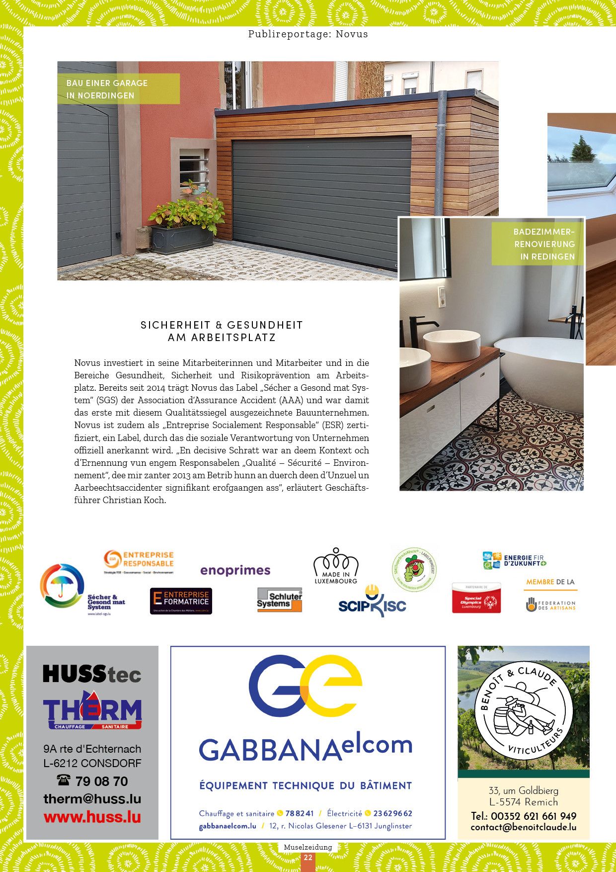 Novus investiert in seine Mitarbeiterinnen und Mitarbeiter und in die Bereiche Gesundheit, Sicherheit und Risikoprävention am Arbeitsplatz. Bereits seit 2014 trägt Novus das Label „Sécher a Gesond mat System“ (SGS) der Association d‘Assurance Accident (AAA) und war damit das erste mit diesem Qualitätssiegel ausgezeichnete Bauunternehmen. Novus ist zudem als „Entreprise Socialement Responsable“ (ESR) zertifitziert, ein Label, durch das die soziale Verabtwortung von Unternehmen offiziell anerkannt wird. «En decisive Schratt war an deem Kontext och d’Ernennung vun engem Responsabelen „Qualité – Sécurité – Environnement“, dee mir zanter 2013 am Betrib hunn an duerch deen d’Unzuel un Aarbeechtaccidenter signifikant erfogaangen ass» erläutert Geschäftsfürer Christian Koch.